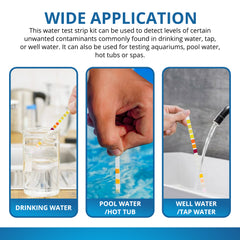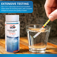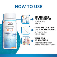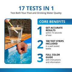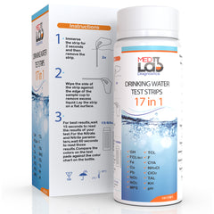Med Lab Diagnostic's 17 in 1 pool and drinking water test kit is a great way to both test your pool water as well as test the quality of different drinking water sources. Our kit contains 100 water reagent test strips. No need to spend a lot of money on expensive drinking water test kits or pool water tests. With our home water tester, you can test your drinking water, tap water, well water, ground water, pool water, hot tub, and spa. Our reagent water test strips also have low-level detection range for heavy metals and contaminants. They provide accurate, reliable results. Determine the mineral content of your water and take appropriate measures for better water quality. Stay healthy and ensure the quality of your water by quickly assessing impurities and making informed decisions about your water.. Easy and safe to use! Just dip the strip, wait 15 seconds, and compare the results to the color chart on the bottle! Included with our strips you will find a helpful full-color guide with instructions for use and an explanation of what each test parameter is used for. Here are the 17 parameters our water test strips can test for: Total Hardness, Free Chlorine ,Iron, Copper, Lead, Nitrate, Nitrite, MPS, Total Chlorine, Fluoride, Cyanuric Acid, Ammonia Chloride, Chlorine Dioxide, Total Alkalinity, Carbonate, pH |
